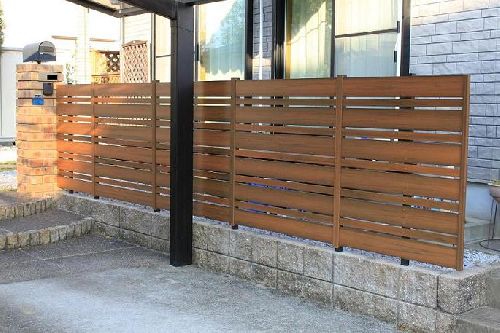 宮崎市まなび野 N様邸 エクシスランドのEウッドスタイルというフェンスです。 高密度ポリスチレンで作られた、木目調の板を自由に組み合わせて、オリジナルなデザインのフェンスが作れます。 ここの現場は、120mmと45mmの板で、高さは1100mmmmです。 柱は35mm角のアルミ製です。 天然木と違って、いつまでも腐ることなく、いつまでも綺麗に残るフェンスです。