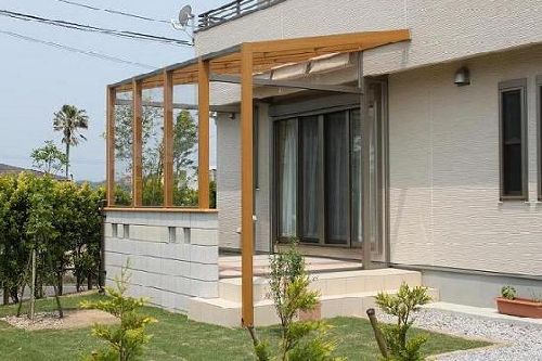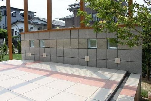 ココマのサイドスルータイプ1.5間×8尺+オープンテラスタイプ0.5間×8尺の結合タイプです。 サイドスルーは腰壁タイプで、後々、折戸パネルを付けて、ガーデンルームに出来る様にしてあります。 腰壁は化粧ブロックを使用して、コストを抑えております。 土間は300角のタイル貼りです。