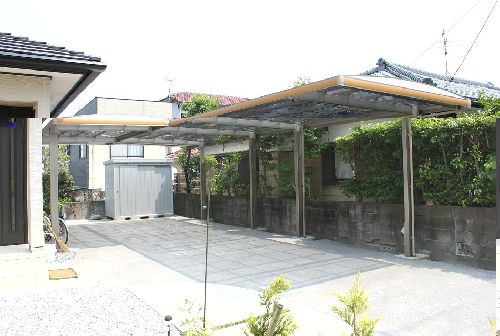 宮崎市月見ヶ丘 TOEX キューブポートプラス 24-50型と30-50型の合掌に、30-50型をさらに縦連棟しました。 L型に3台分のカーポートです。