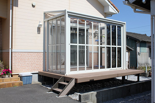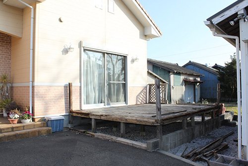 O様邸 フィリアII: 2間×8尺 デッキ仕様 デッキ: 樹ら楽ステージ オプション: 内部日除け、引違い網戸、物干し掛け。 ▼ビフォー